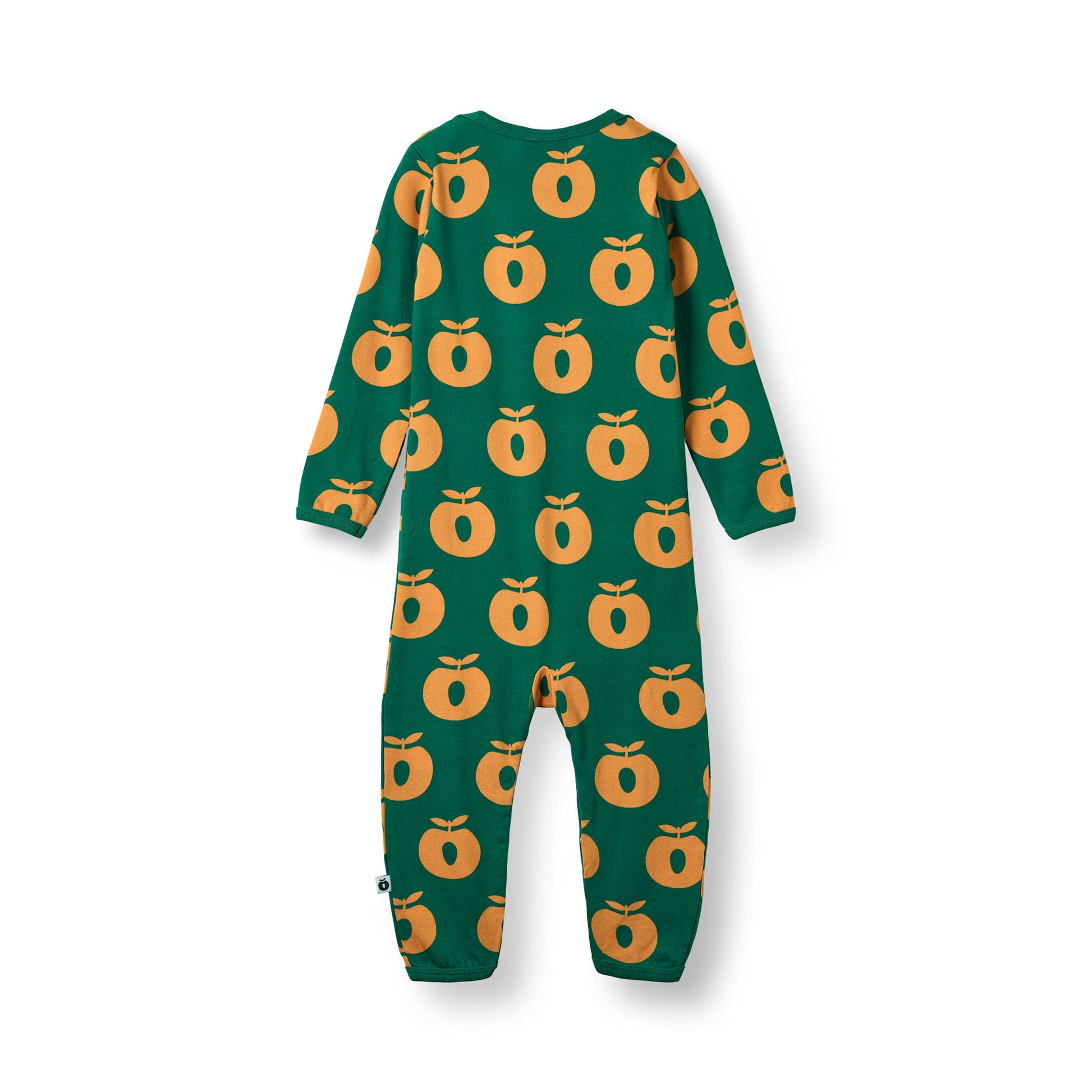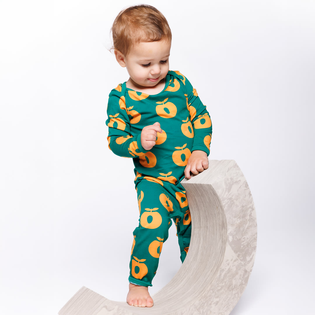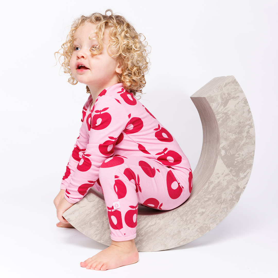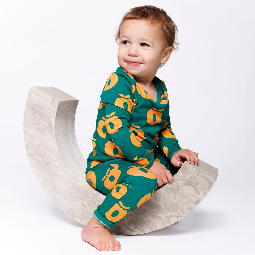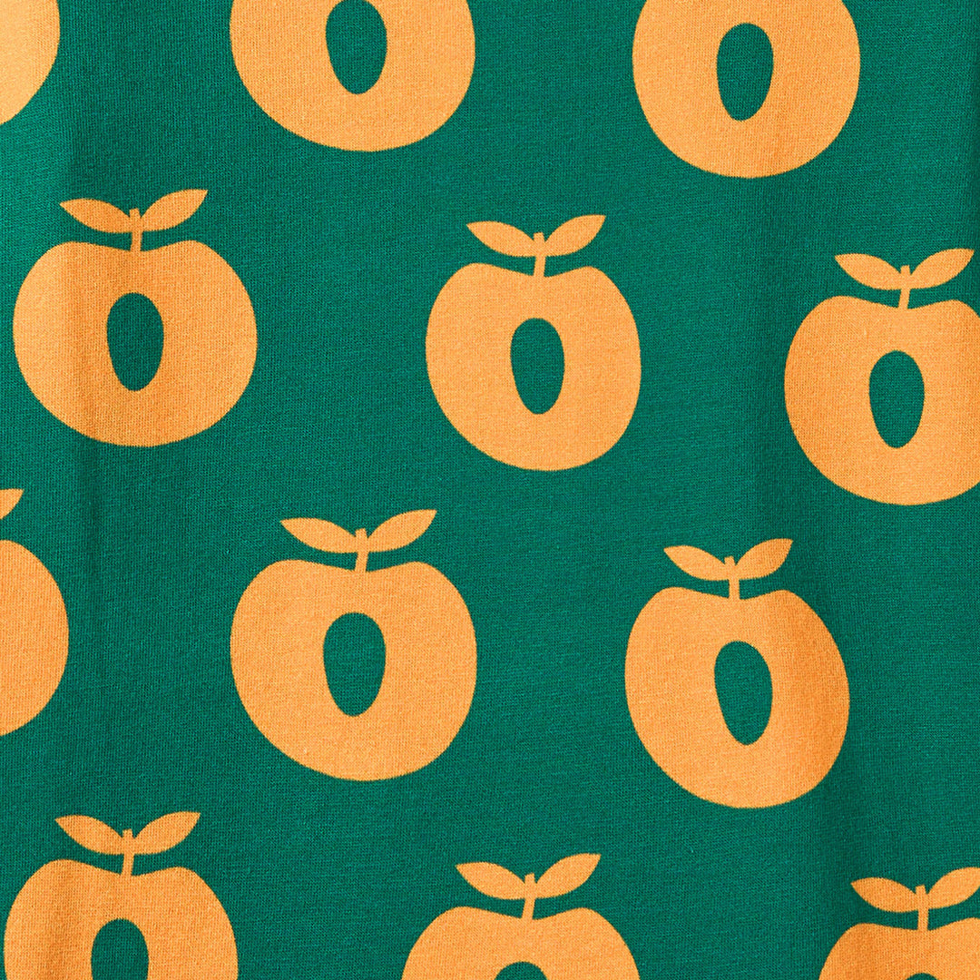 Einteiler für Babys mit Äpfeln, hergestellt aus dehnbarem Bio-Baumwolljersey. Dieser Overall ist nach OEKO-TEX Standard 100® zertifiziert, was bedeutet, dass der Anzug hergestellt und auf Schadstoffe getestet wurde, sodass Sie sich um die Haut und Gesundheit Ihres Kindes kümmern können.