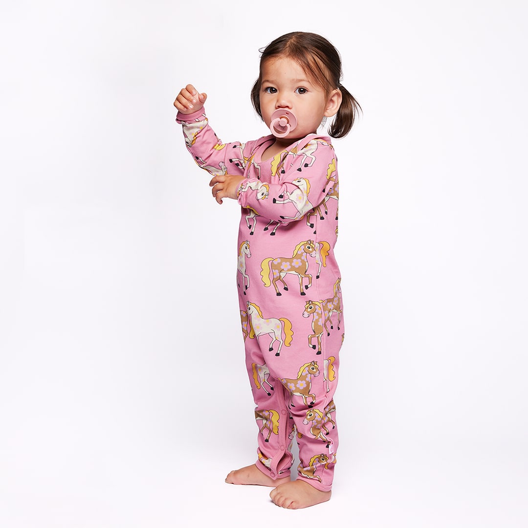 Einteiler für Babys mit Pferden, hergestellt aus dehnbarem Bio-Baumwolljersey. Dieser Overall ist nach OEKO-TEX Standard 100® zertifiziert, was bedeutet, dass der Anzug hergestellt und auf Schadstoffe getestet wurde, sodass Sie sich um die Haut und Gesundheit Ihres Kindes kümmern können.