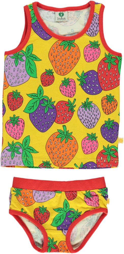Unterwäsche-Set mit Erdbeerdruck in Småfolks ganz eigenem, einzigartigen Retro-Stil. Das Set wurde in Dänemark entworfen und aus 100 % bester Bio-Baumwolle und Elasthan hergestellt, was das Set dehnbar und weich macht und gleichzeitig die Passform beibehält an der Taille.