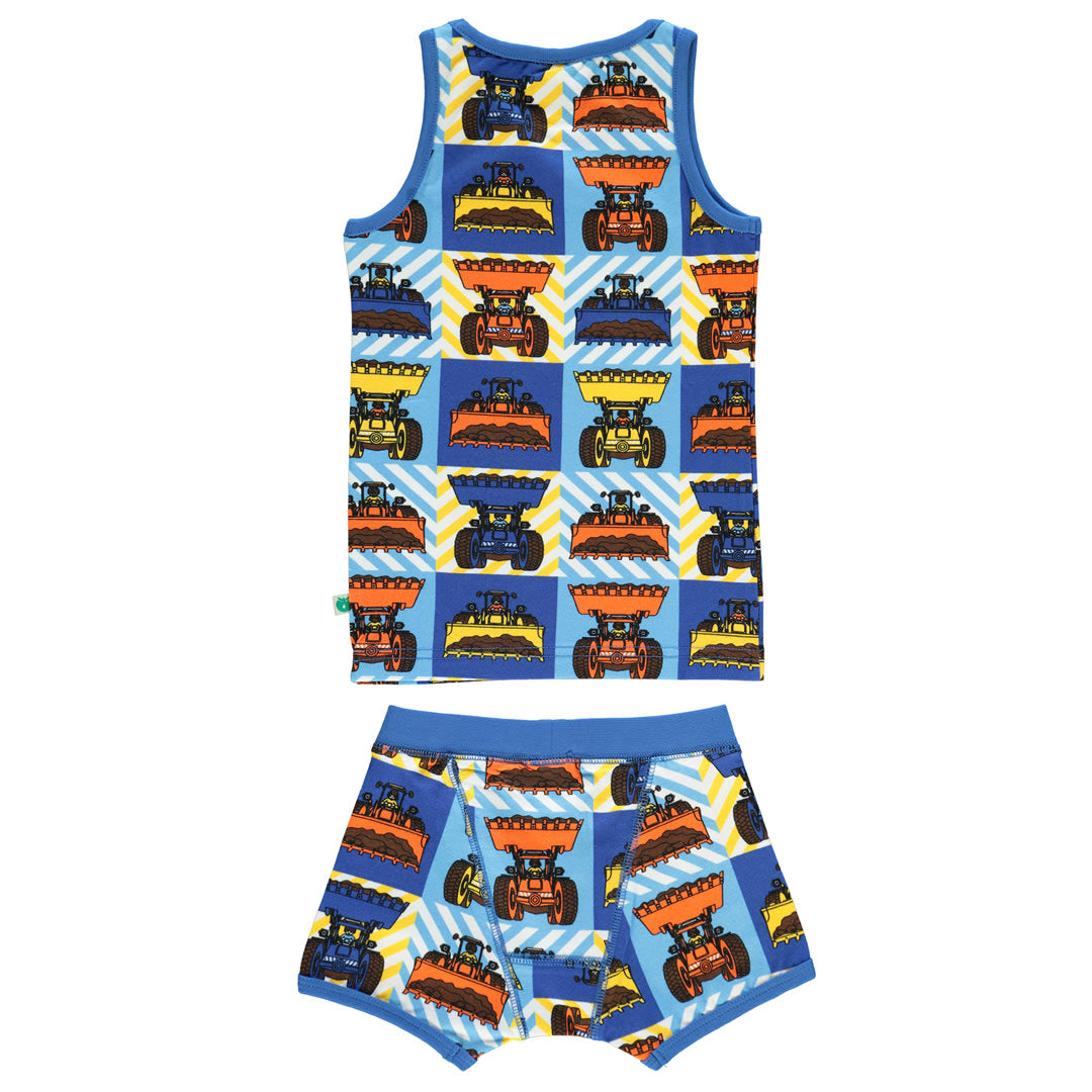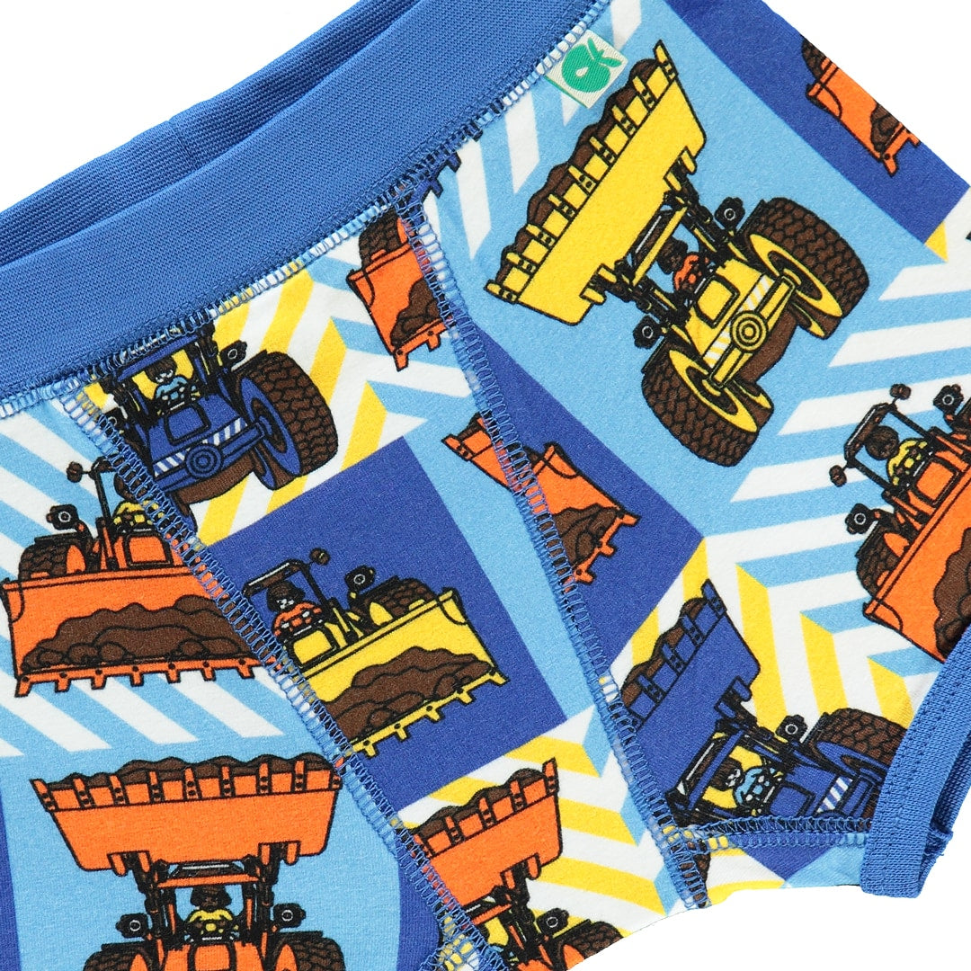 Unterwäsche-Set mit Bagger-Print, hergestellt aus organischem und dehnbarem Baumwolljersey. Dieses Set ist nach OEKO-TEX Standard 100® zertifiziert, was bedeutet, dass die Unterwäsche hergestellt und auf Schadstoffe getestet wurde, sodass Sie sich um die Haut und Gesundheit Ihres Kindes kümmern können.