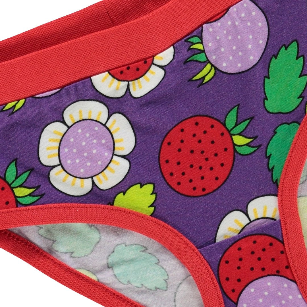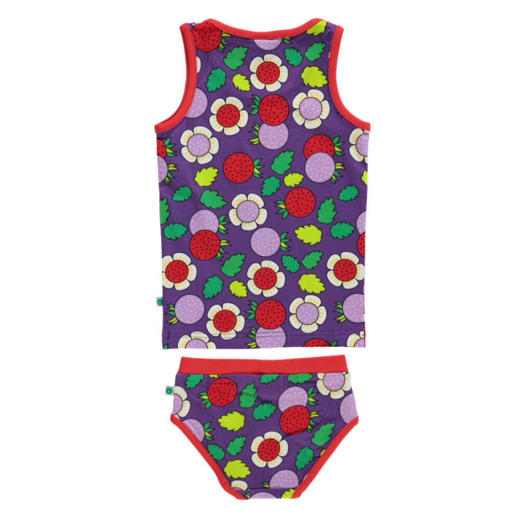 Unterwäsche-Set mit Erdbeer-Print, hergestellt aus organischem und dehnbarem Baumwolljersey. Dieses Set ist nach OEKO-TEX Standard 100® zertifiziert, was bedeutet, dass die Unterwäsche hergestellt und auf Schadstoffe getestet wurde, sodass Sie sich um die Haut und Gesundheit Ihres Kindes kümmern können.