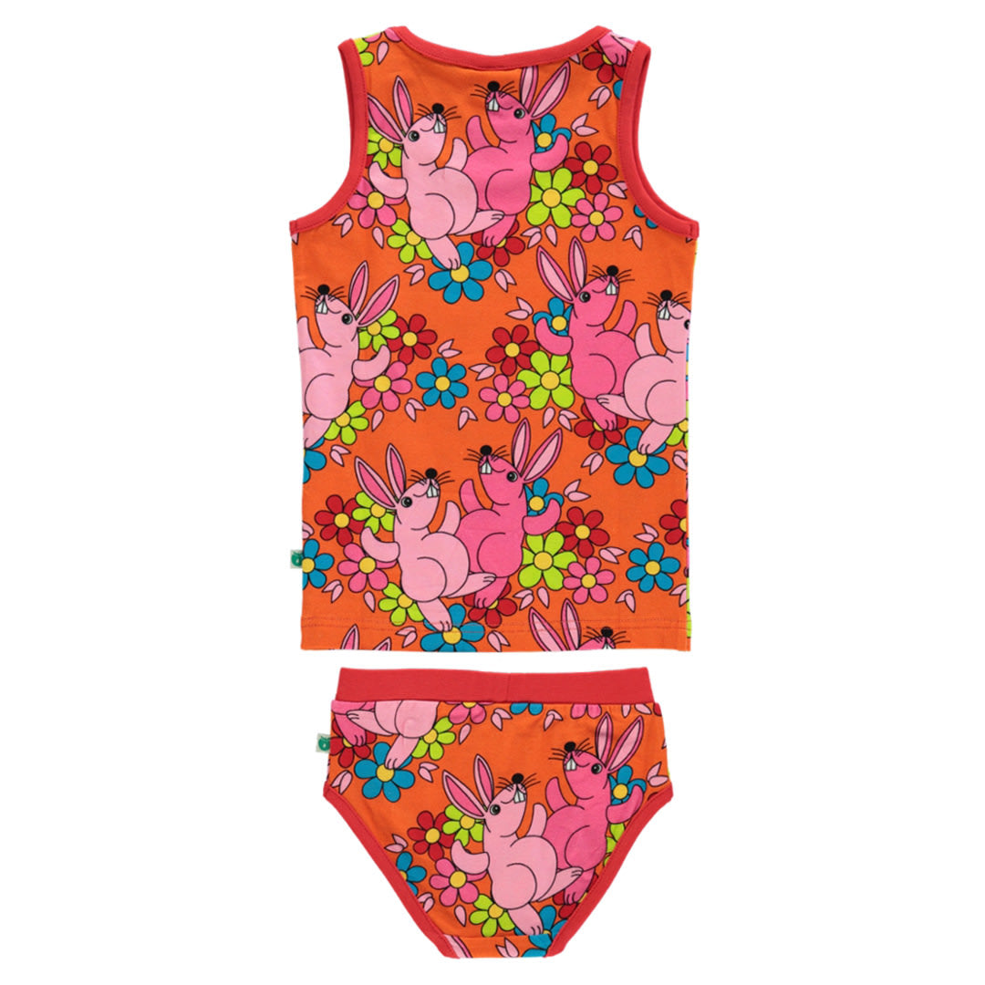 Unterwäsche-Set mit Kaninchen-Print, hergestellt aus organischem und dehnbarem Baumwolljersey. Dieses Set ist nach OEKO-TEX Standard 100® zertifiziert, was bedeutet, dass die Unterwäsche hergestellt und auf Schadstoffe getestet wurde, sodass Sie sich um die Haut und Gesundheit Ihres Kindes kümmern können.