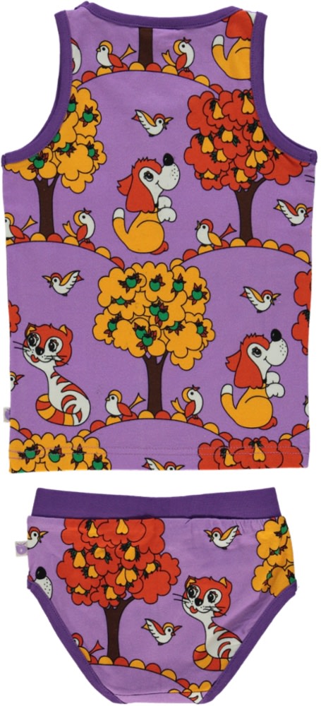 Das Set besteht aus einem ärmellosen Oberteil mit Rippenbündchen an Hals und Armlöchern sowie einer Unterhose mit Rippenbündchen und elastischem Bund. Das Unterwäscheset hat eine normale Passform. Die Unterwäsche von Småfolk wird in Dänemark mit dem Ziel entworfen, unzähligen Abenteuern und Spielen standzuhalten und auch nach mehrmaligem Gebrauch Form und Farbe zu behalten.