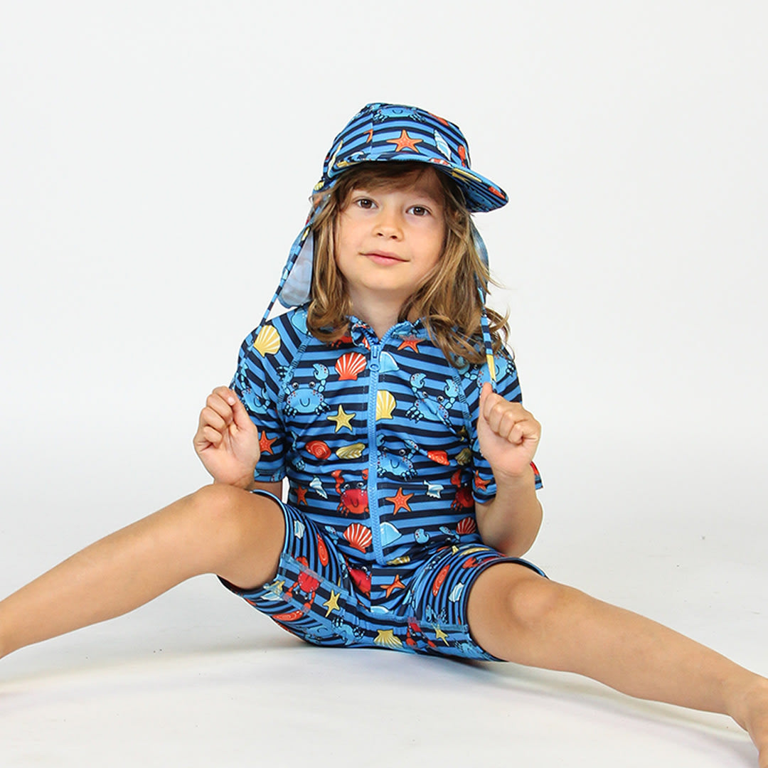 Sonnenhut mit Seepferdchen, hergestellt aus dehnbarem und strapazierfähigem Polyester. Die Badebekleidung von Småfolk schützt die Haut Ihres Kindes mit dem in den Stoff eingearbeiteten UV-Faktor UPF50+. Der Sonnenhut eignet sich perfekt als Badehut mit einer Schattenschicht vorne, einer Schnur, die ihn an Ort und Stelle hält, und Schatten im Nacken. Die Badebekleidung von Småfolk wird in Dänemark mit dem Ziel entworfen, unzähligen Abenteuern und Spielen standzuhalten und auch nach mehrmaligem Gebrauch Form und Farbe zu behalten. Damit die Badebekleidung ihre schönen Farben behält, empfiehlt Småfolk, die Badebekleidung in sauberem, kaltem Leitungswasser auszuspülen. Vermeiden Sie das Trocknen in direktem Sonnenlicht und vermeiden Sie jegliche Verwendung von Wäschetrocknern. Um die glatte Oberfläche zu erhalten, empfehlen wir jeglichen Kontakt mit rauen Oberflächen zu vermeiden.