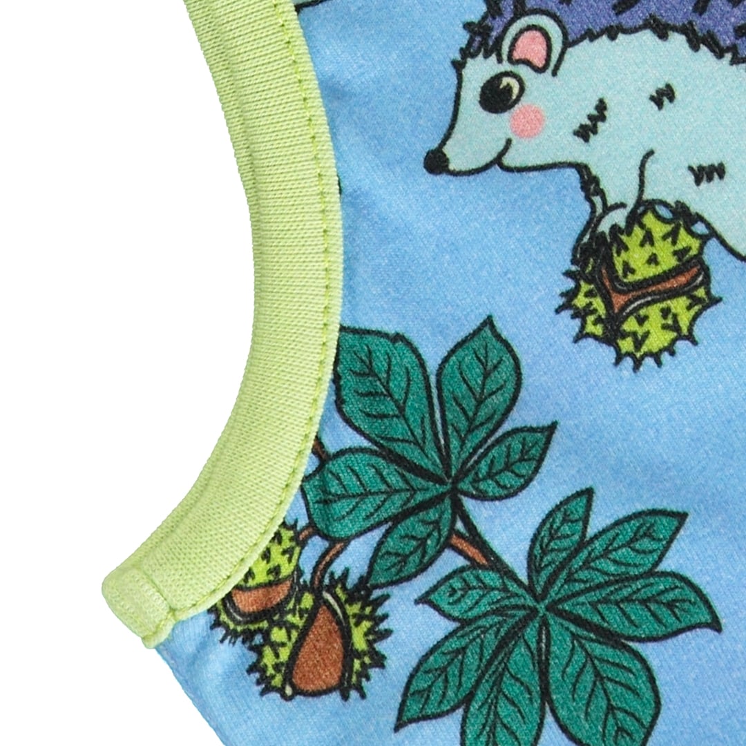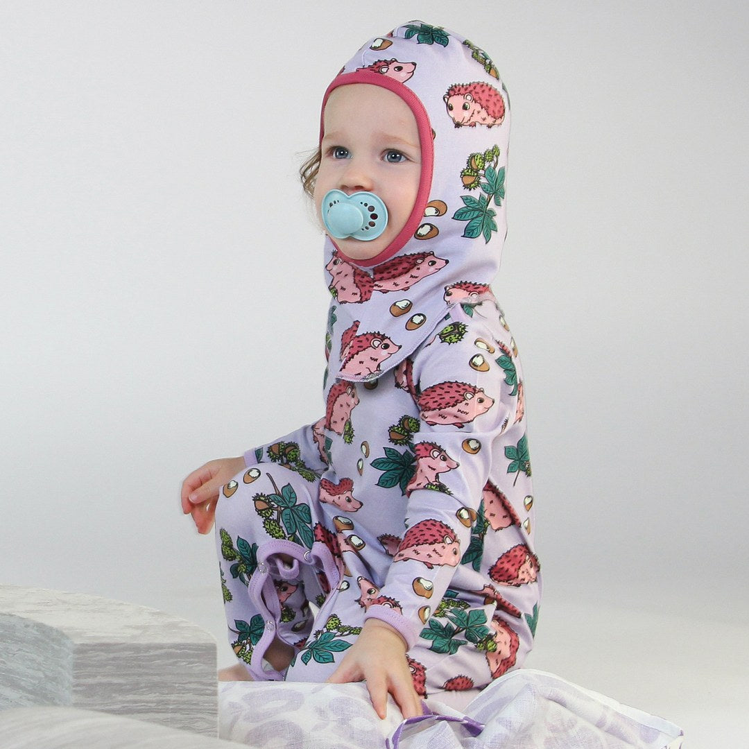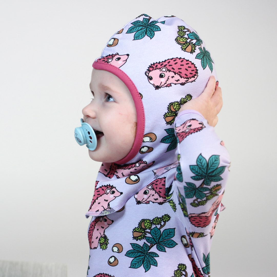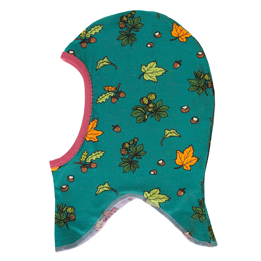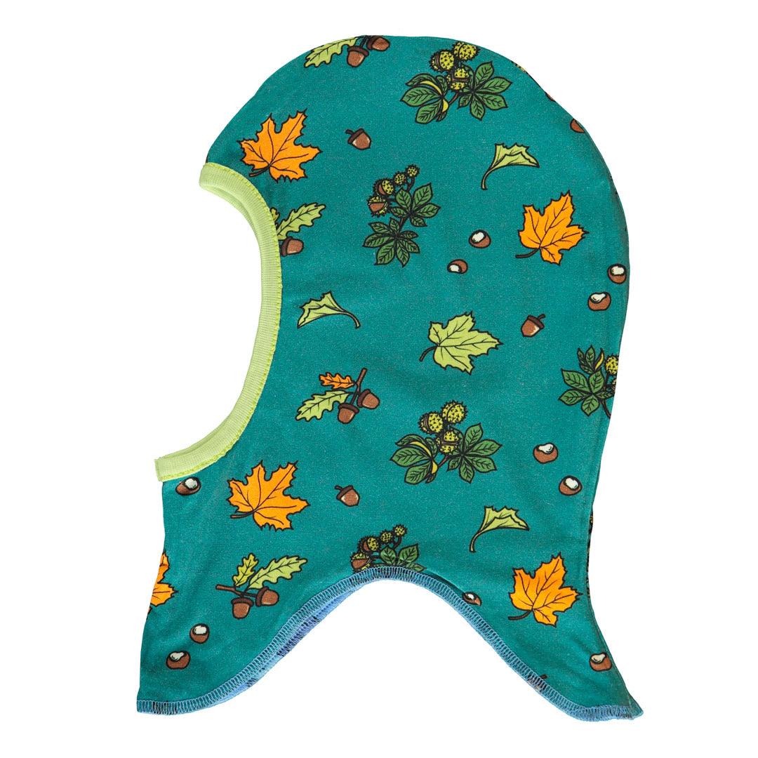 Wende-Sturmhaube mit Igeln und Herbstblättern, hergestellt aus dehnbarem Bio-Baumwolljersey. Diese Mütze ist nach OEKO-TEX Standard 100® zertifiziert, was bedeutet, dass die Mütze hergestellt und auf Schadstoffe getestet wurde, sodass Sie sich um die Haut und Gesundheit Ihres Kindes kümmern können.