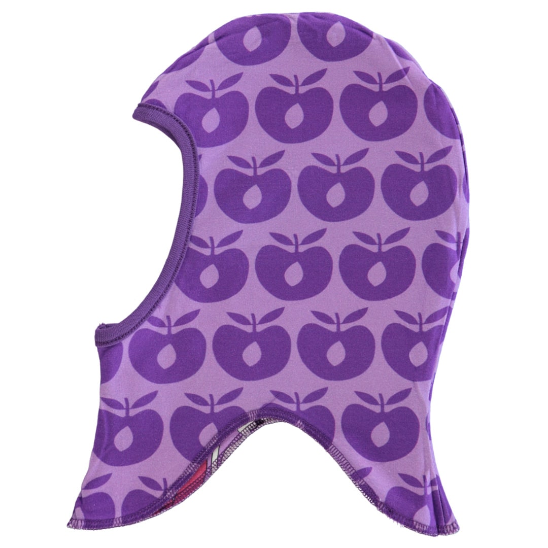 Wende-Sturmhaube mit Äpfeln und Katzen, hergestellt aus dehnbarem Bio-Baumwolljersey. Diese Mütze ist nach OEKO-TEX Standard 100® zertifiziert, was bedeutet, dass die Mütze hergestellt und auf Schadstoffe getestet wurde, sodass Sie sich um die Haut und Gesundheit Ihres Kindes kümmern können.