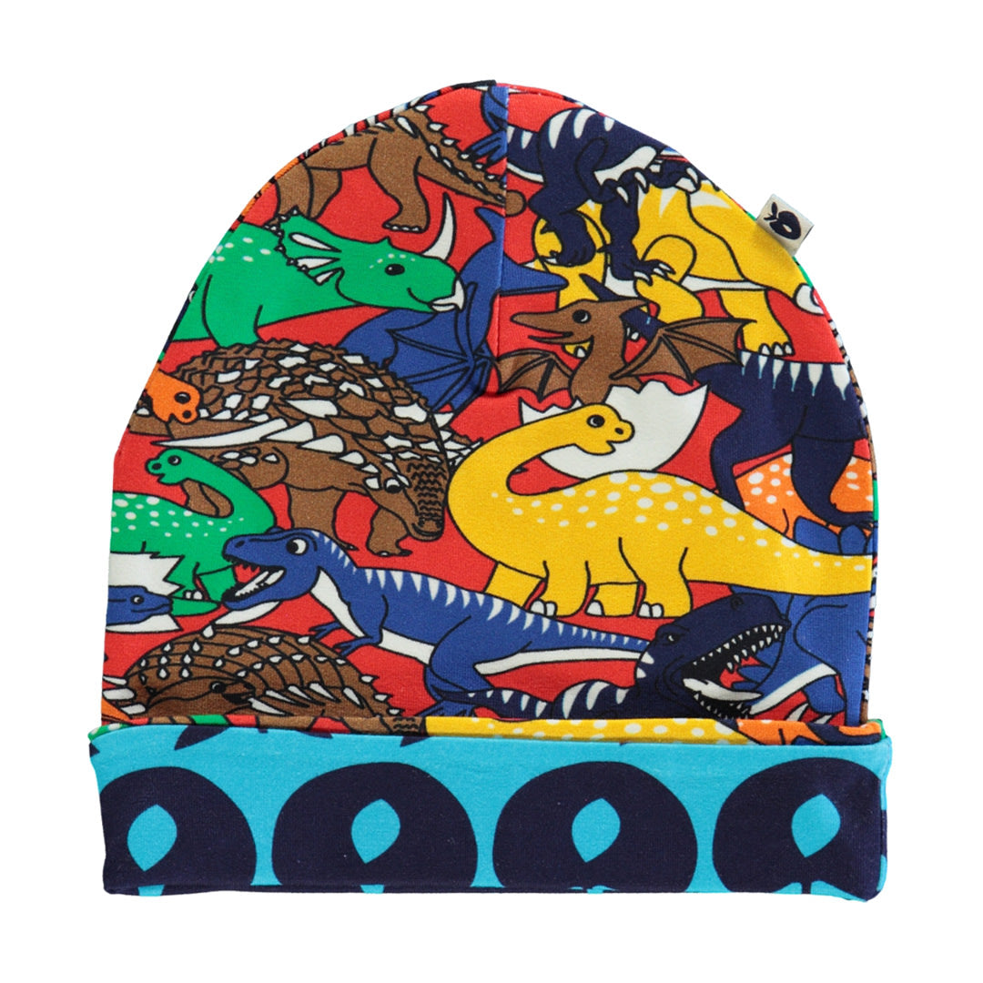 Wendemütze mit Äpfeln und Dinosaurier, hergestellt aus dehnbarem Bio-Baumwolljersey. Diese Mütze ist nach OEKO-TEX Standard 100® zertifiziert, was bedeutet, dass die Mütze hergestellt und auf Schadstoffe getestet wurde, sodass Sie sich um die Haut und Gesundheit Ihres Kindes kümmern können.