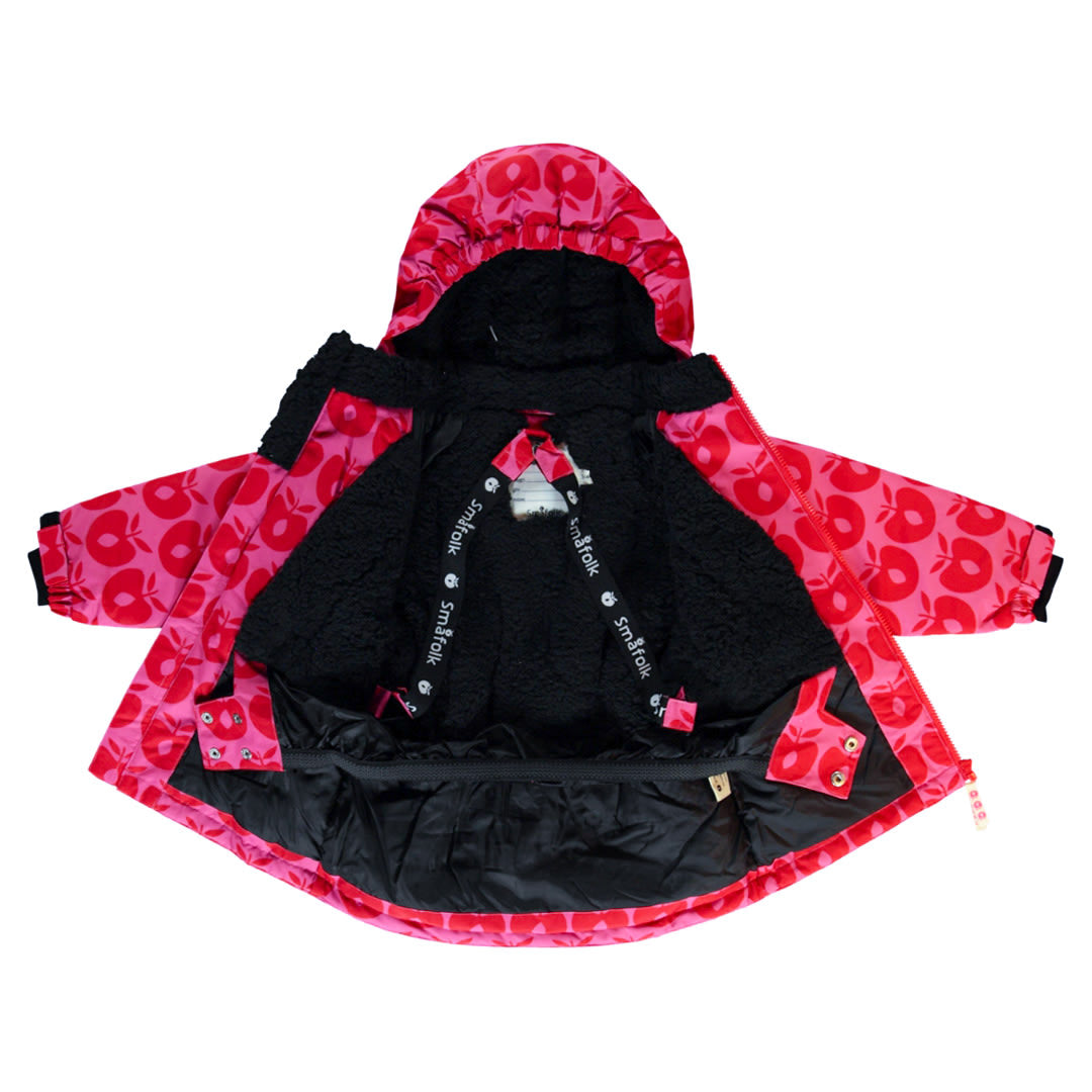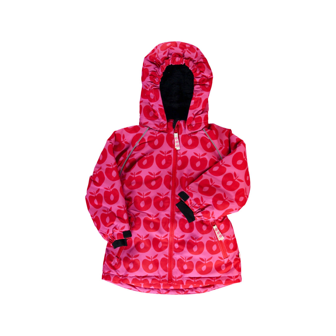 Winterjacke mit Äpfeln. Die Jacke hat einen Frontreißverschluss und eine abnehmbare Kapuze mit Teddyfleece. Die Jacke verfügt über Hosenträger im Inneren und einen verstellbaren Windschutz an der Unterseite der Jacke sowie Windschutz und Klettverschlüsse an den Handgelenken, die ebenfalls angepasst werden können. Die Winterjacke hat reflektierende Paspeln an den Armen.