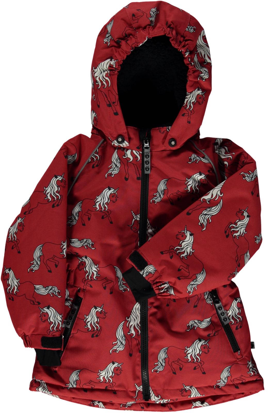 Winterjacke mit Einhörnern. Die Jacke hat einen Frontreißverschluss und eine abnehmbare Kapuze mit Teddyfleece. Die Jacke verfügt über Hosenträger im Inneren und einen verstellbaren Windschutz an der Unterseite der Jacke sowie Windschutz und Klettverschlüsse an den Handgelenken, die ebenfalls angepasst werden können. Die Winterjacke hat reflektierende Paspeln an den Armen.