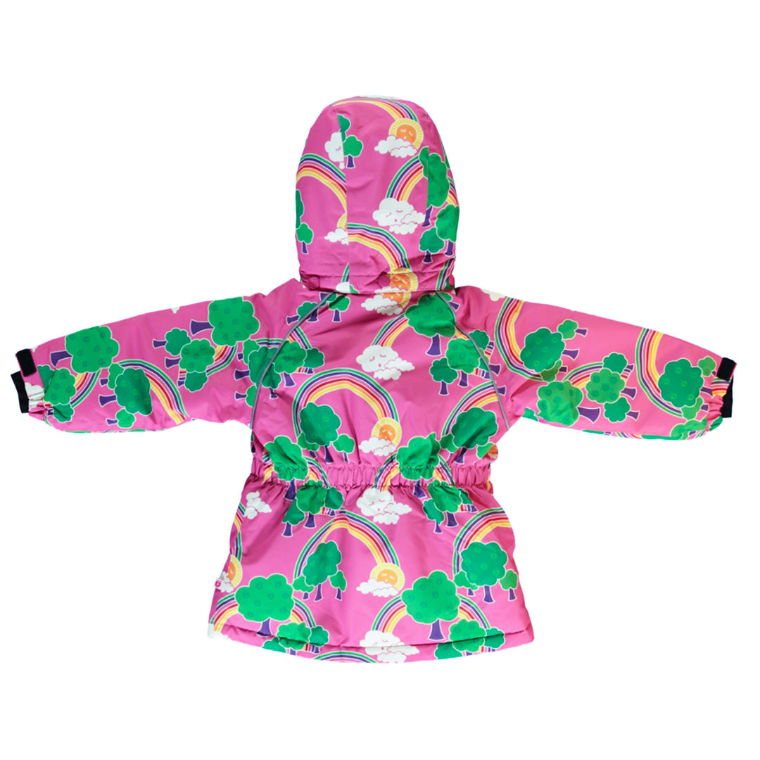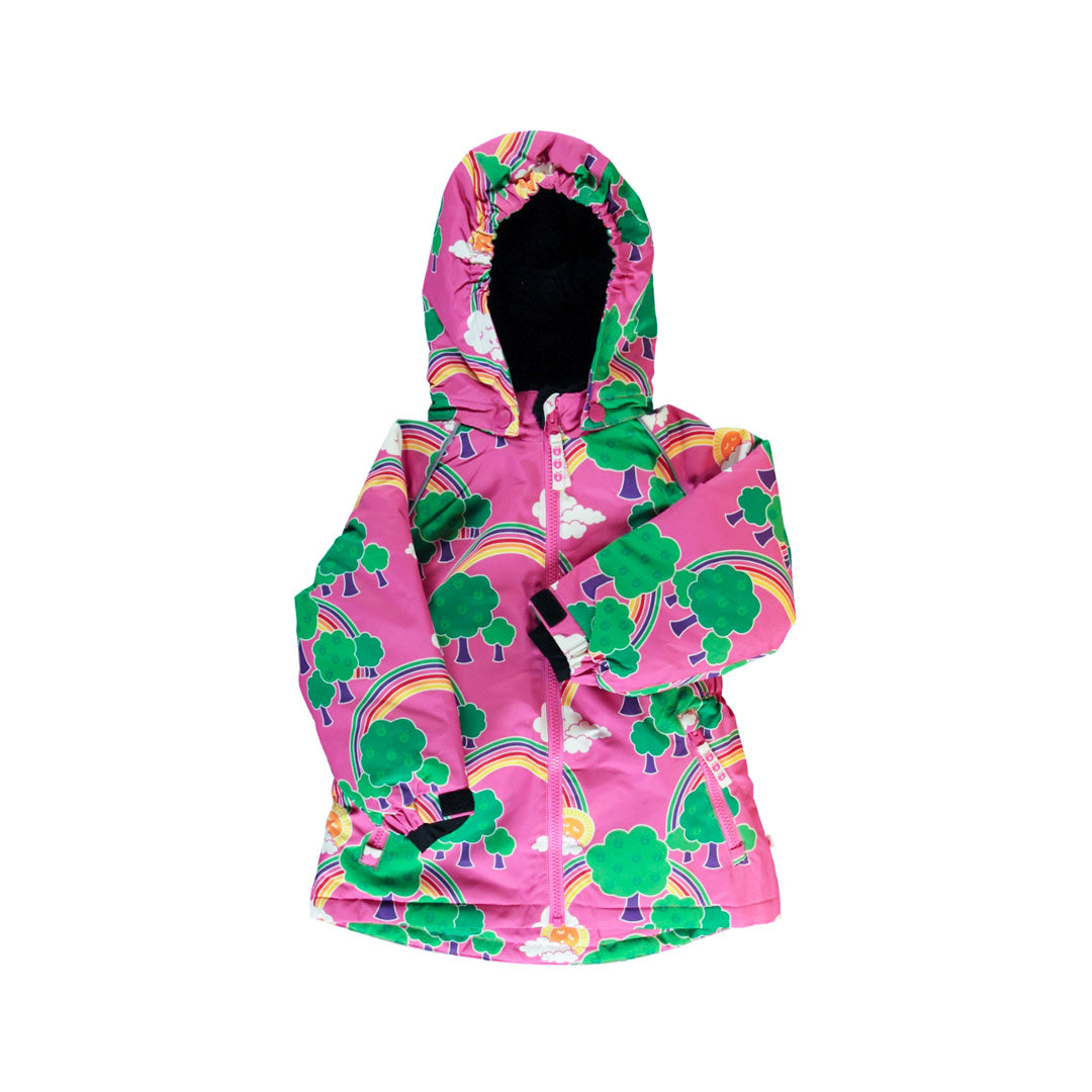 Winterjacke mit Regenbogen. Die Jacke hat einen Frontreißverschluss und eine abnehmbare Kapuze mit Teddyfleece. Die Jacke verfügt über Hosenträger im Inneren und einen verstellbaren Windschutz an der Unterseite der Jacke sowie Windschutz und Klettverschlüsse an den Handgelenken, die ebenfalls angepasst werden können. Die Winterjacke hat reflektierende Paspeln an den Armen.