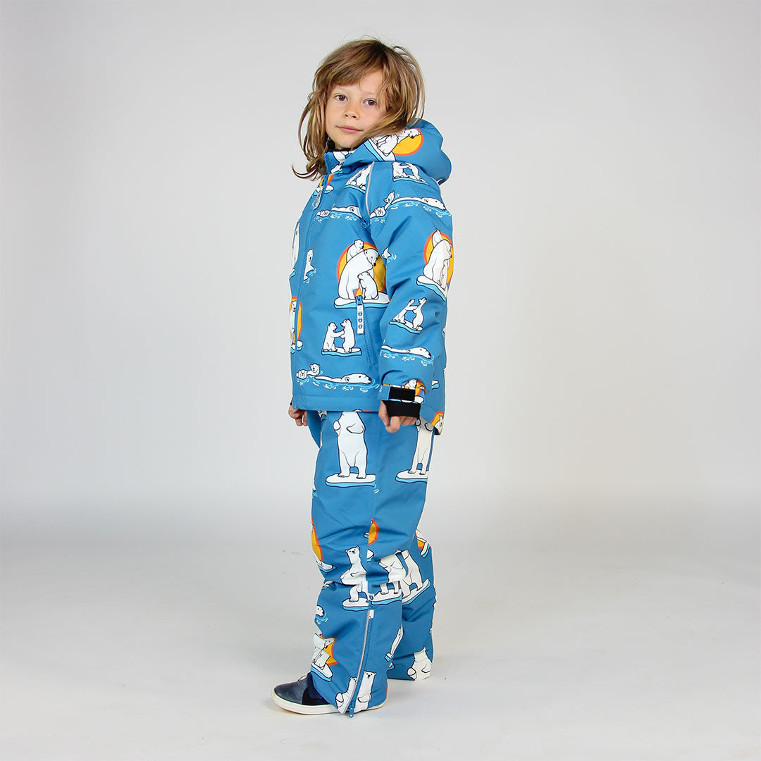 Winterjacke mit Eisbären. Die Jacke hat einen Frontreißverschluss und eine abnehmbare Kapuze mit Teddyfleece. Die Jacke verfügt über Hosenträger im Inneren und einen verstellbaren Windschutz an der Unterseite der Jacke sowie Windschutz und Klettverschlüsse an den Handgelenken, die ebenfalls angepasst werden können. Die Winterjacke hat reflektierende Paspeln an den Armen.