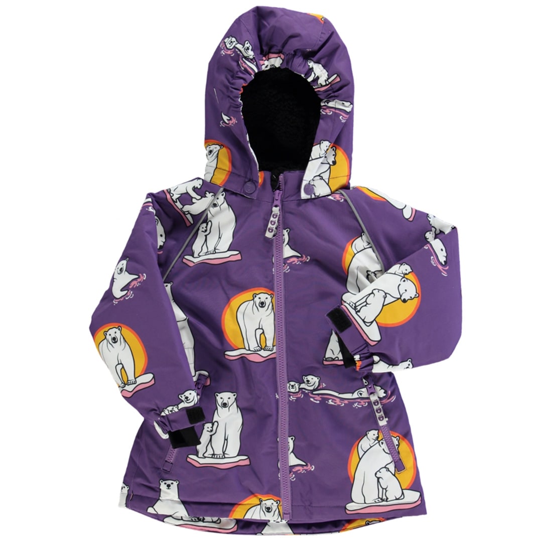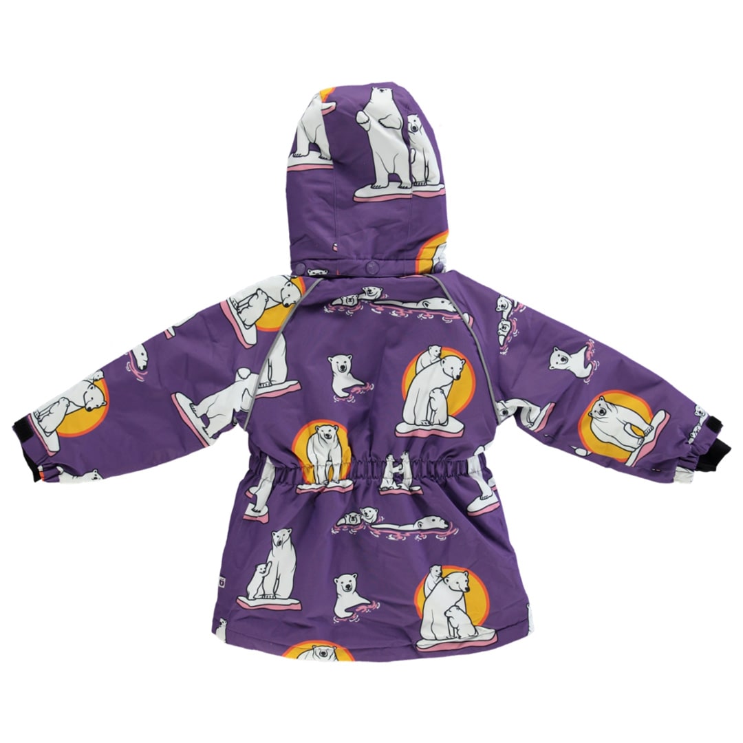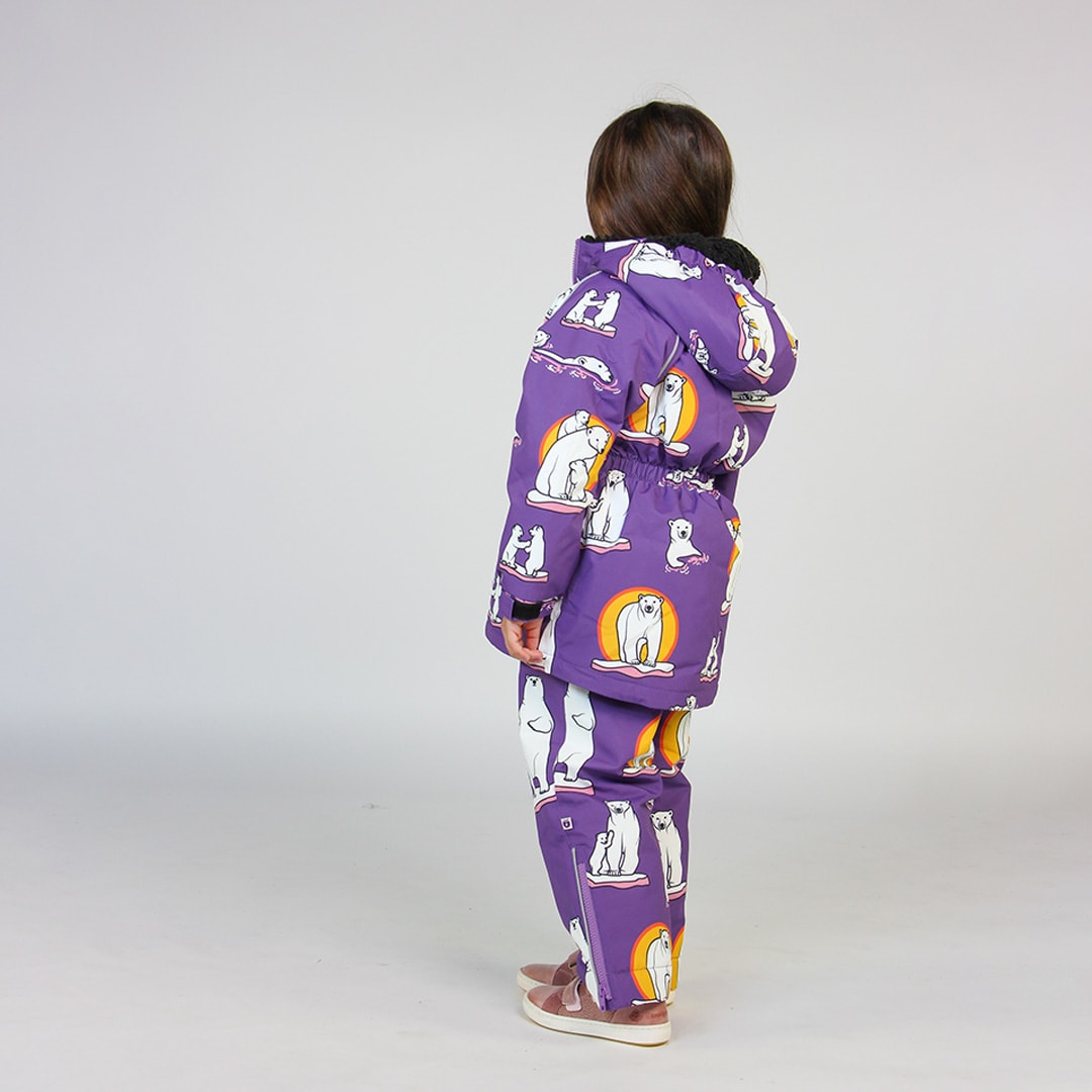 Winterjacke mit Eisbären. Der Mantel hat einen Frontreißverschluss und eine abnehmbare Kapuze mit Teddyfleece. Die Jacke verfügt über Hosenträger und eine verstellbare Windschutzleiste an der Unterseite der Jacke sowie Windschutzleisten und Klettverschlüsse an den Handgelenken, die ebenfalls angepasst werden können. Der Wintermantel hat reflektierende Paspeln an den Armen und einen Gummizug auf der Rückseite, der dem Mantel Form verleiht.