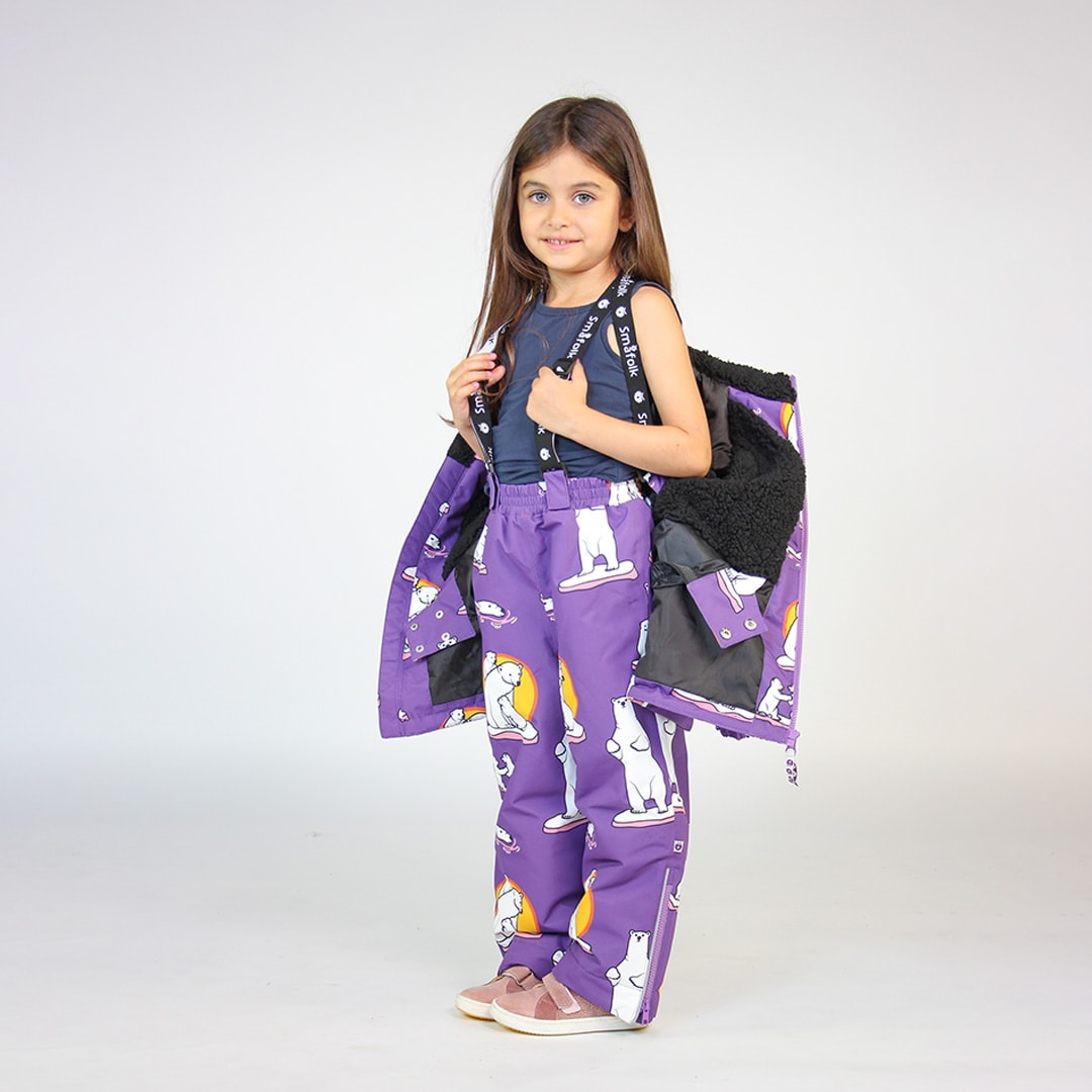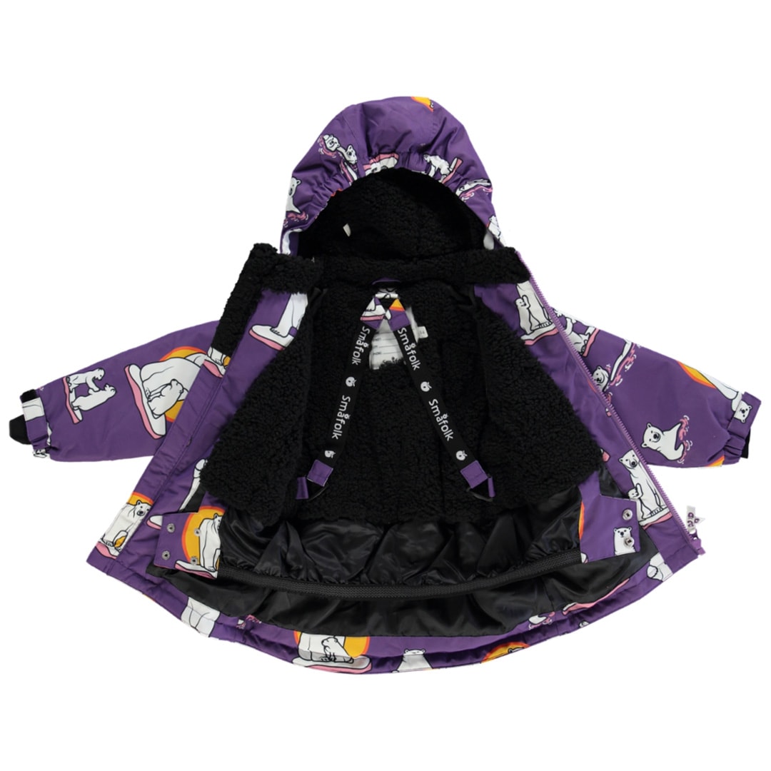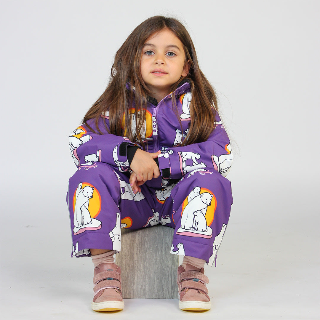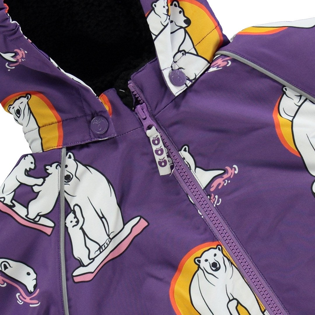 Winterjacke mit Eisbären. Der Mantel hat einen Frontreißverschluss und eine abnehmbare Kapuze mit Teddyfleece. Die Jacke verfügt über Hosenträger und eine verstellbare Windschutzleiste an der Unterseite der Jacke sowie Windschutzleisten und Klettverschlüsse an den Handgelenken, die ebenfalls angepasst werden können. Der Wintermantel hat reflektierende Paspeln an den Armen und einen Gummizug auf der Rückseite, der dem Mantel Form verleiht.