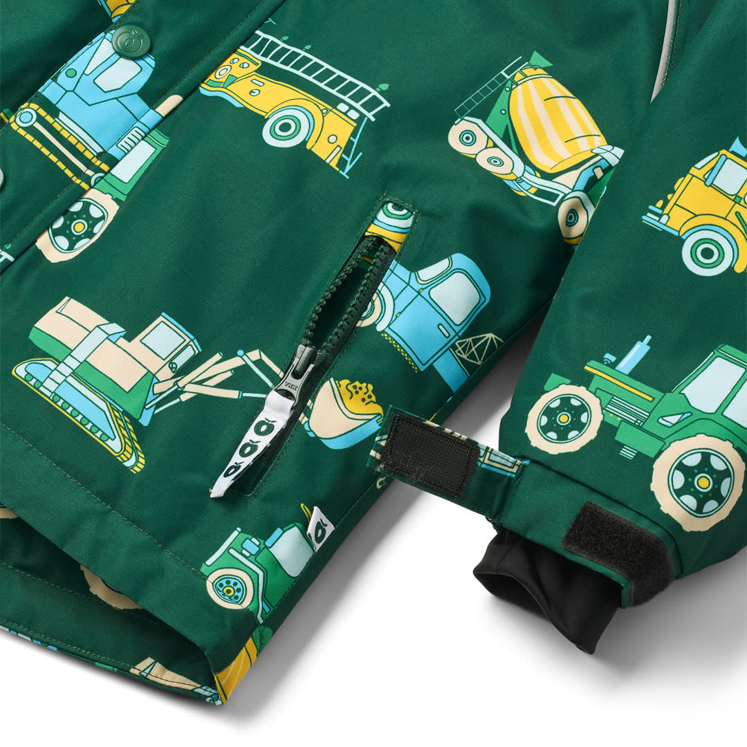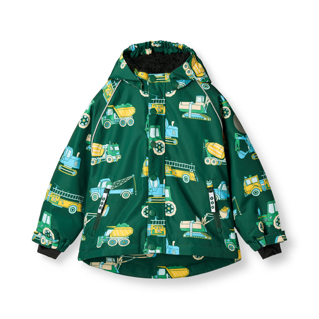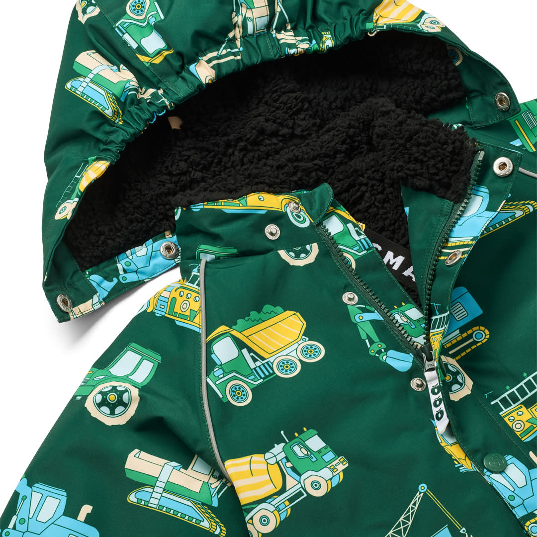 Winterjacke mit Fahrzeugen. Die Jacke hat einen Frontreißverschluss und eine abnehmbare Kapuze mit Teddyfleece. Die Jacke verfügt über Hosenträger im Inneren und einen verstellbaren Windschutz an der Unterseite der Jacke sowie Windschutz und Klettverschlüsse an den Handgelenken, die ebenfalls angepasst werden können. Die Winterjacke hat reflektierende Paspeln an den Armen.
