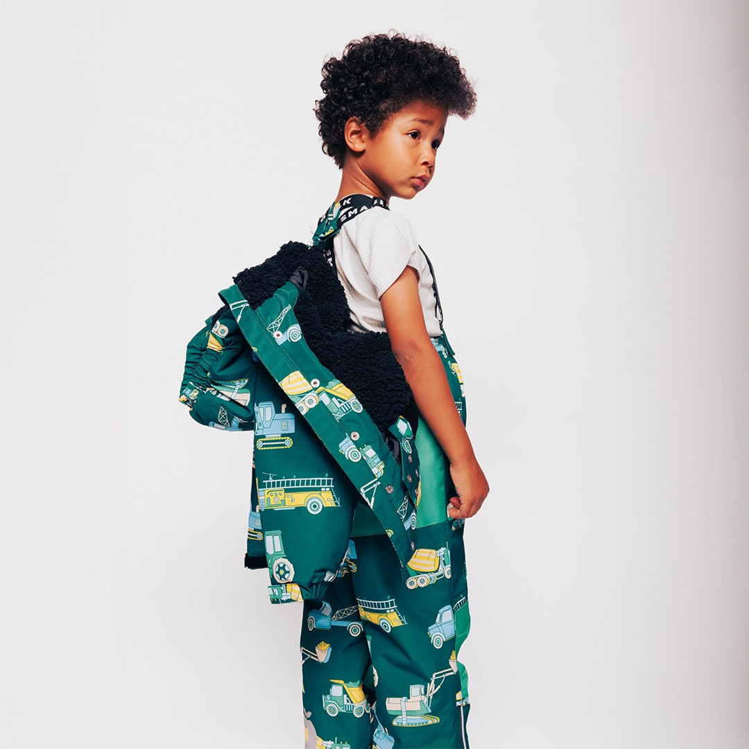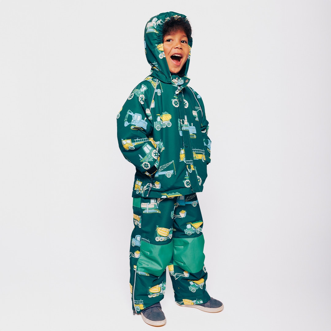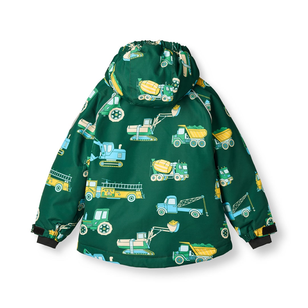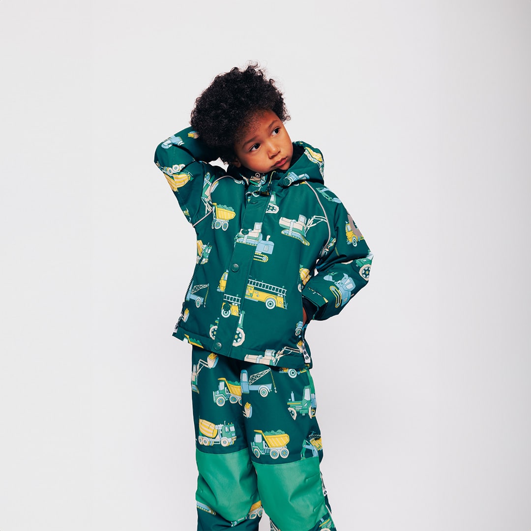 Winterjacke mit Fahrzeugen. Die Jacke hat einen Frontreißverschluss und eine abnehmbare Kapuze mit Teddyfleece. Die Jacke verfügt über Hosenträger im Inneren und einen verstellbaren Windschutz an der Unterseite der Jacke sowie Windschutz und Klettverschlüsse an den Handgelenken, die ebenfalls angepasst werden können. Die Winterjacke hat reflektierende Paspeln an den Armen.