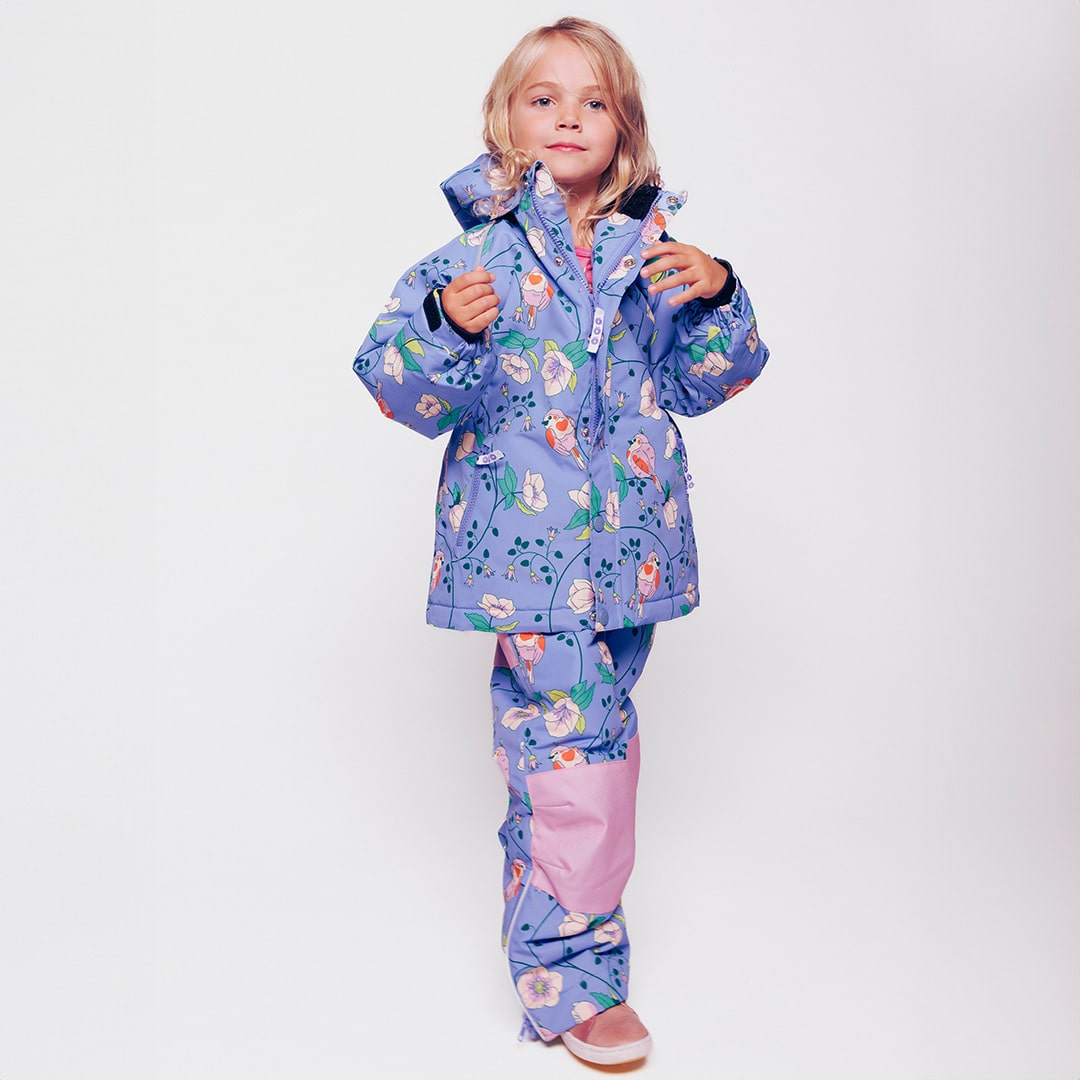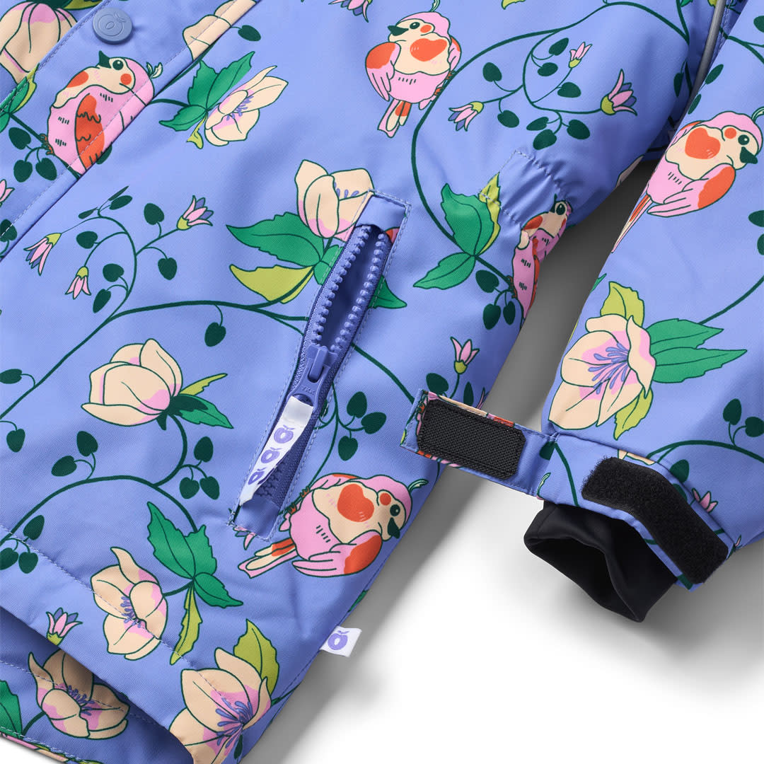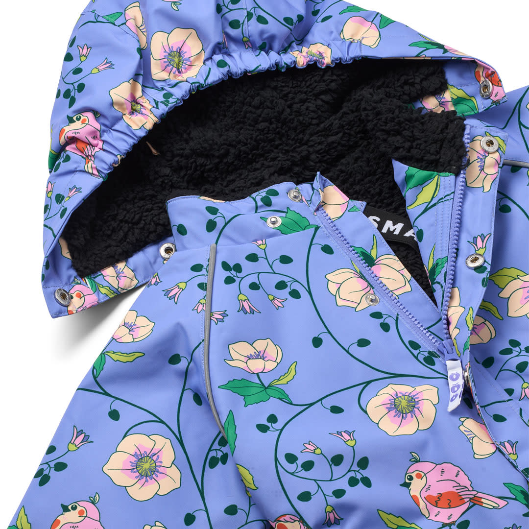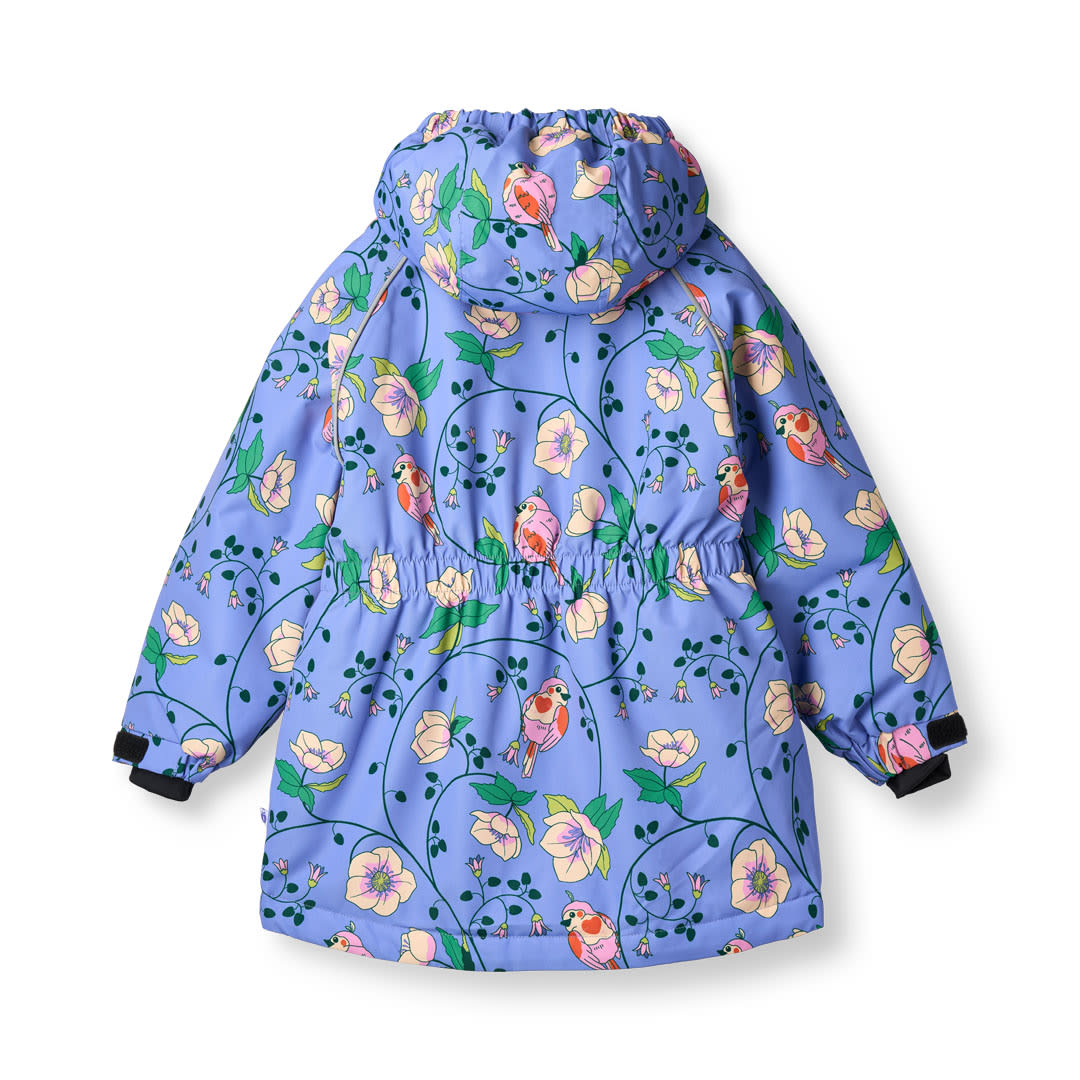 Winterjacke mit Vögeln und Blumen. Der Mantel hat einen Frontreißverschluss und eine abnehmbare Kapuze mit Teddyfleece. Die Jacke verfügt über Hosenträger und eine verstellbare Windschutzleiste an der Unterseite der Jacke sowie Windschutzleisten und Klettverschlüsse an den Handgelenken, die ebenfalls angepasst werden können. Der Wintermantel hat reflektierende Paspeln an den Armen und einen Gummizug auf der Rückseite, der dem Mantel Form verleiht.